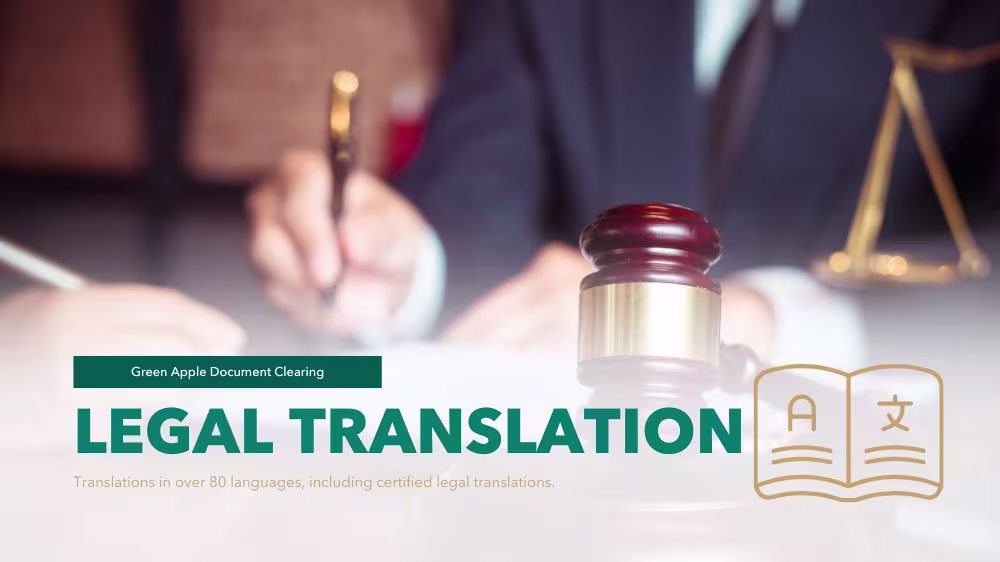 في Green Apple Document Clearing، نسهل عملية الترجمة القانونية بكفاءة. سواء كنت بحاجة إلى ترجمات لأغراض تجارية، شخصية، أو قانونية، ففريقنا هنا لمساعدتك. اتصل بنا اليوم للحصول على ترجمات معتمدة بأكثر من 80 لغة.