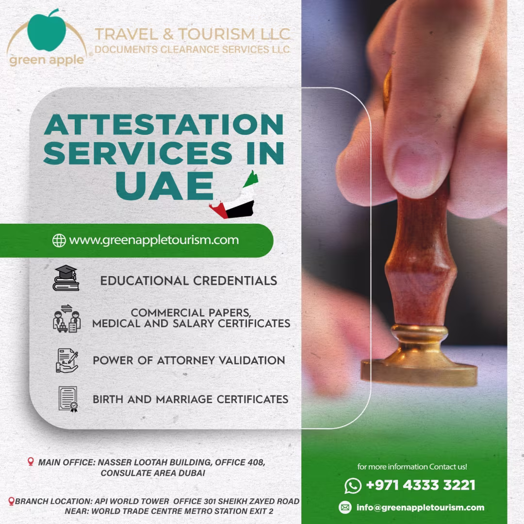 For more information on our attestation services or to get started with your document verification process, please contact us at +971 4333 3221 or email info@greenappletourism.com. Visit our website www.greenappletourism.com to learn more about our services and how we can assist you.