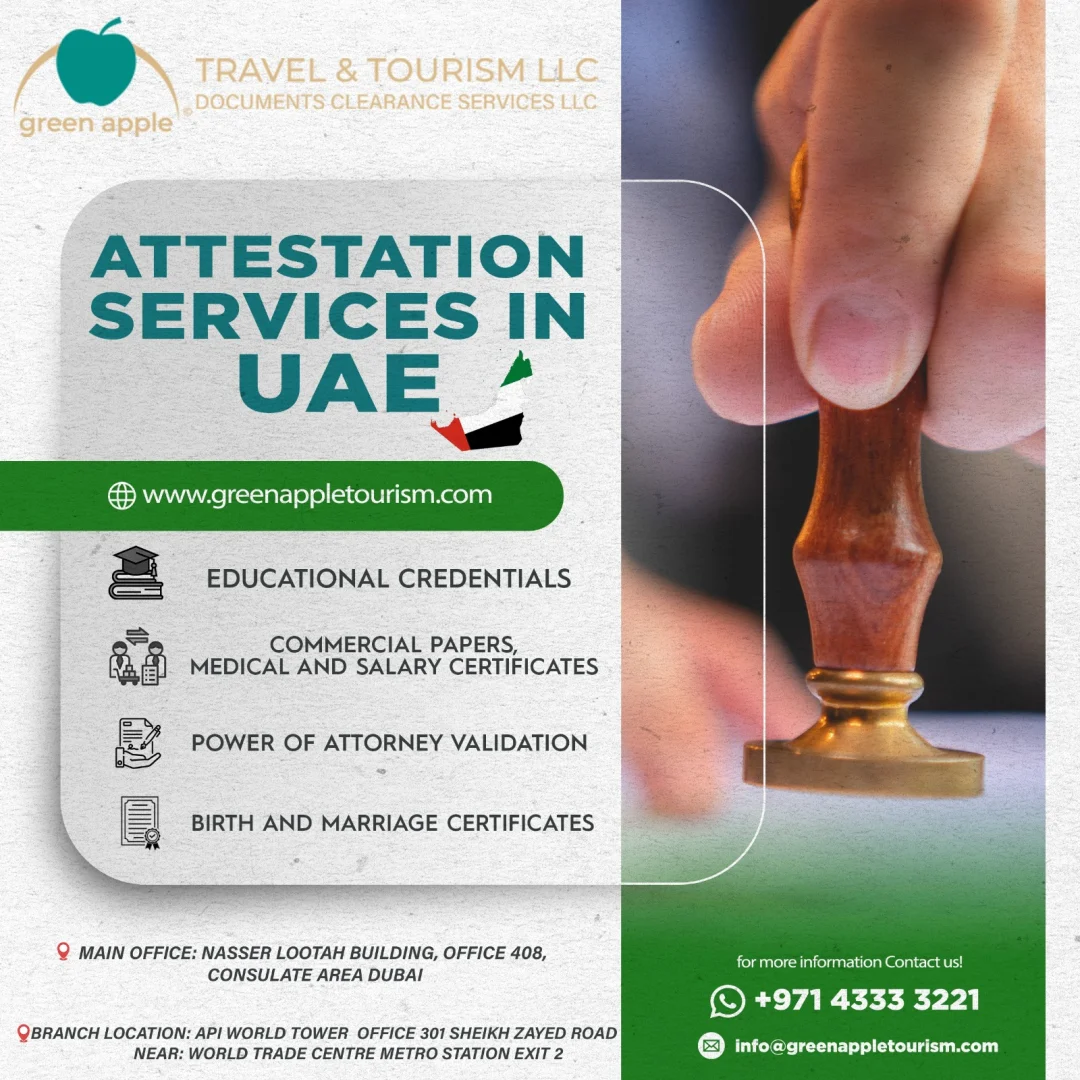 Discover top-notch attestation services in UAE for educational, commercial, medical documents, and more with Green Apple Travel & Tourism LLC. Ensure your documents are legally recognized globally.